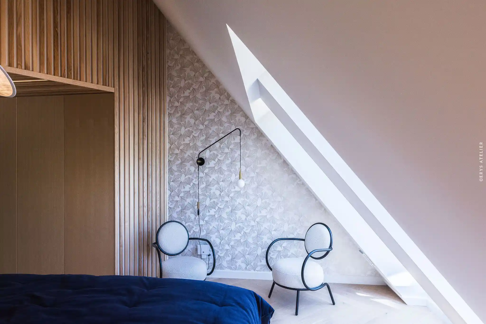 Au premier et second étage, trois chambres avec salles d’eau privatives et plancher chauffant/rafraîchissant.