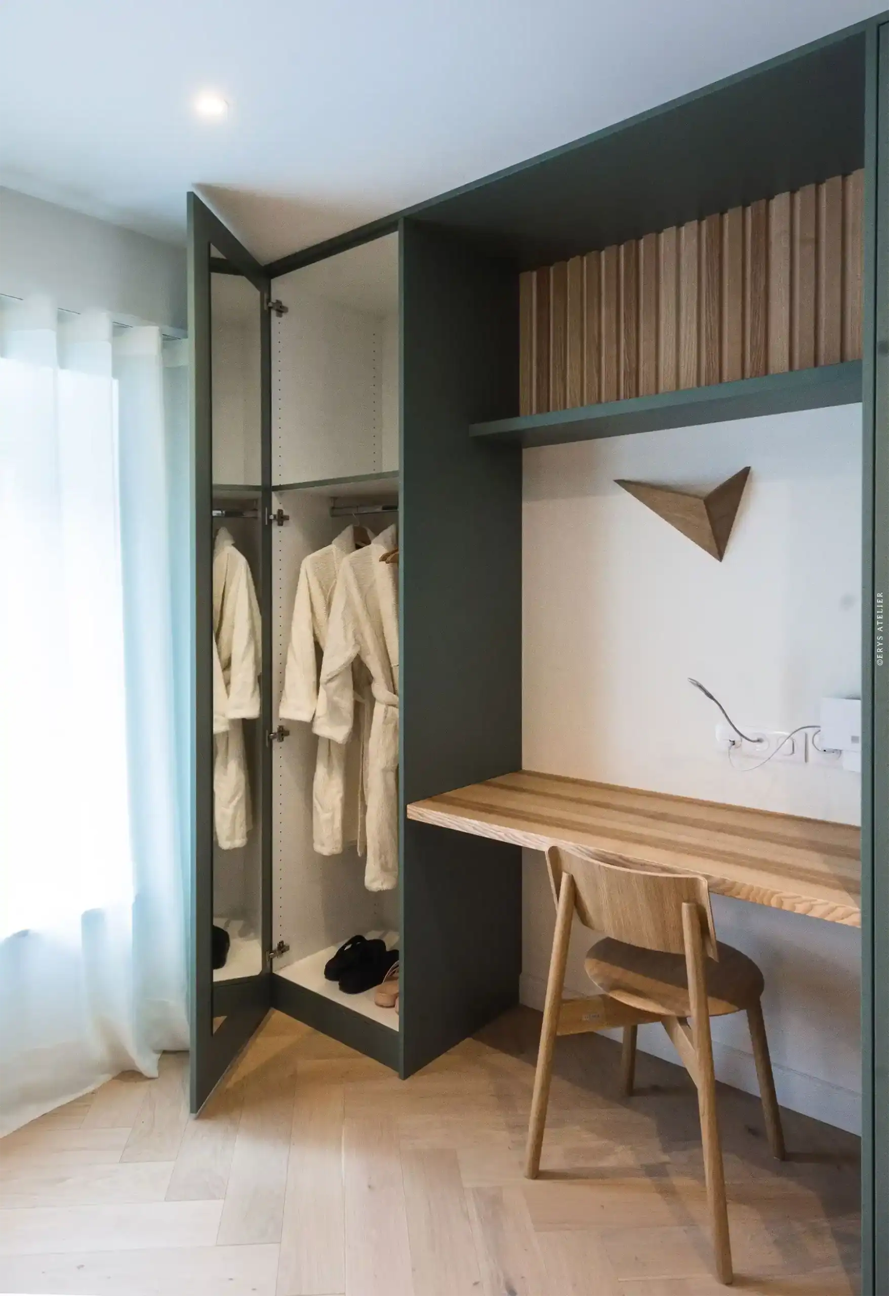 La chambre Bouleau s’inspire des forêts, enveloppant ses hôtes d’un vert feutré à la fois apaisant et raffiné. Le tableau végétal surplombant la tête de lit distille une sérénité boisée, tel un sous-bois accueillant.