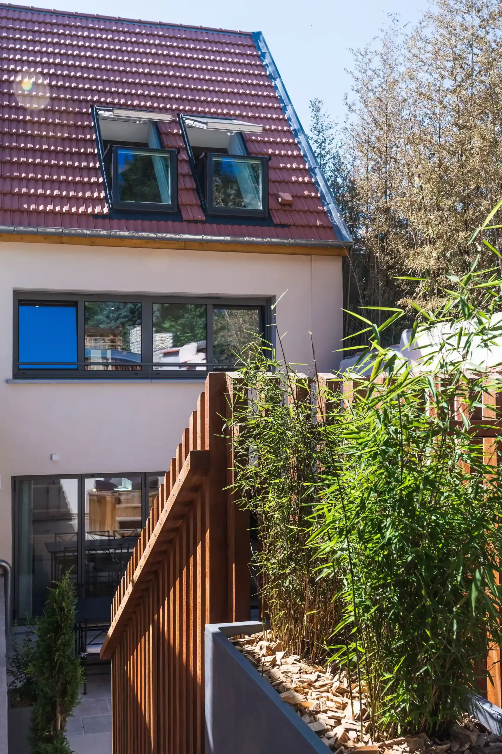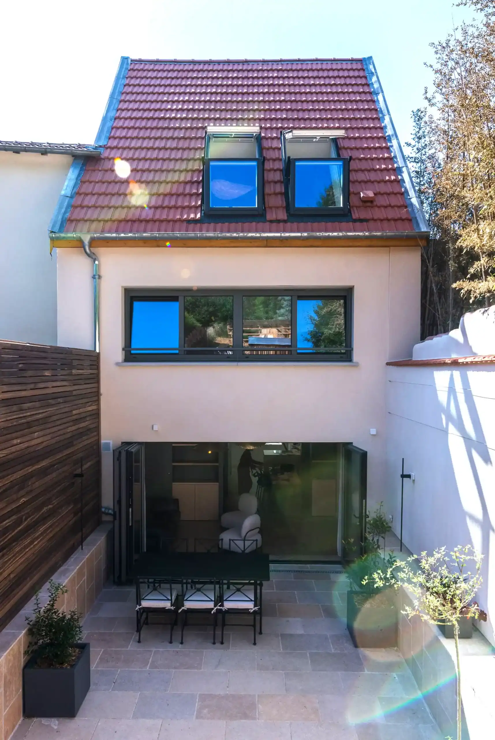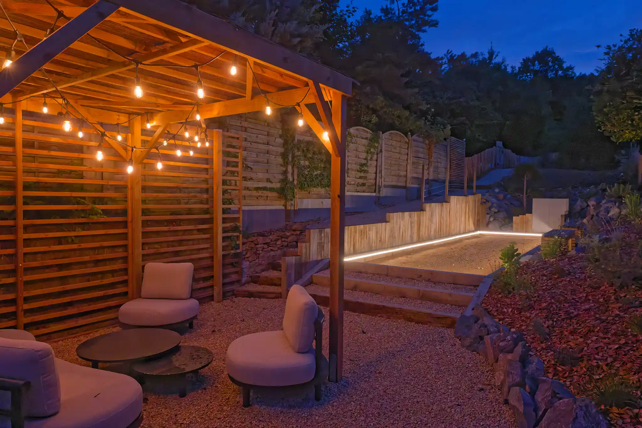 L’évasion se poursuit à l’extérieur avec un beau jardin paysagé sur 3 niveaux et plusieurs espaces de détente : une terrasse avec table de jardin et 6 chaises, un bain nordique à remous en Red Cedar, un solarium avec chaises basses de relaxation pour savourer le soleil lorrain, un salon de jardin sous pergola en bois et canisses et même un terrain de pétanque pour réveiller votre esprit convivial.