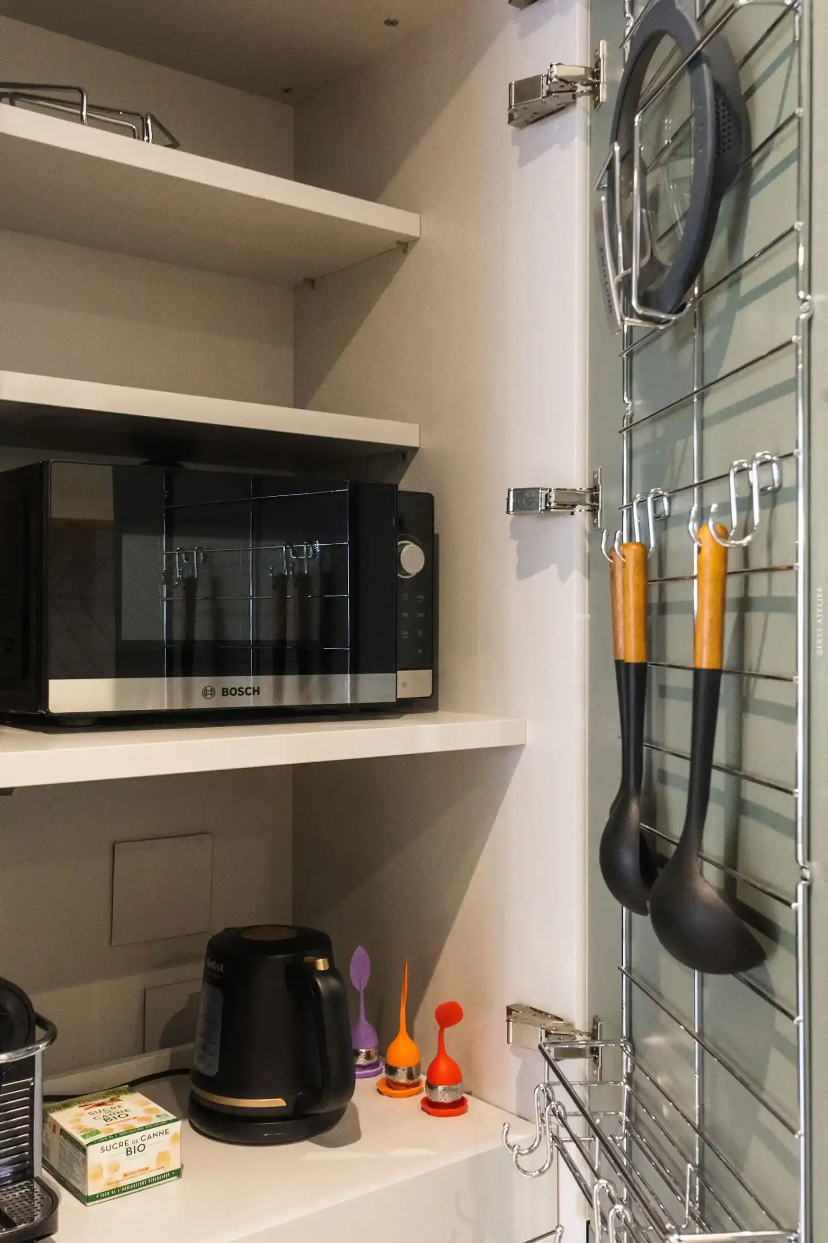 Deux chambres élégantes vous attendent : la chambre Cerisier et la chambre Bouleau, chacune disposant de sa salle d’eau privative communicante, équipée de douches à l’italienne. Le confort est aussi personnalisable : les lits en 180×200 « king size » se transforment en deux lits simples selon vos besoins. Chaque niveau dispose d’un WC japonais indépendant, et un plancher chauffant/rafraîchissant assure une température idéale toute l’année, que la neige tombe ou que le soleil brille.